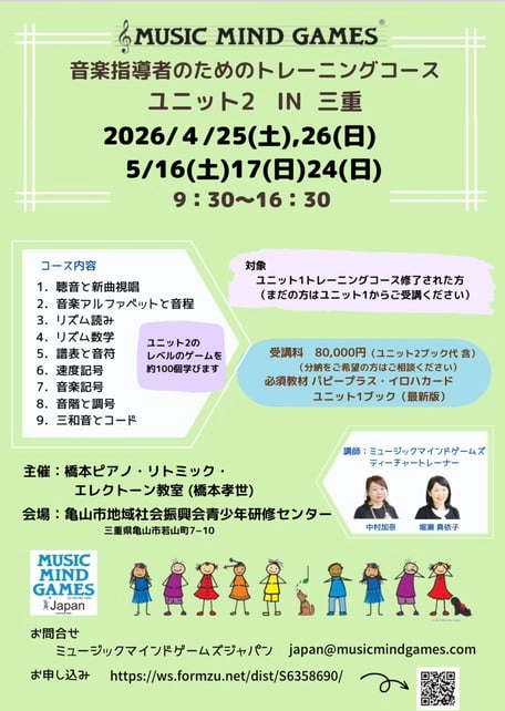 三重ユニット2 【とき】 2026年4月25日(土)、26日(日)5月16日(土)、17日(日)、24日(日)9:30~16:30 【ところ】亀山市地域社会振興会青少年研修センター 【対象】音楽指導者 【受講料】¥80,000 (ユニット2ブック代 含)分納をご希望の方はご相談ください 【必須教材】パピープラス・イロハカードユニット1ブック(最新版) 【講師】MMGティーチャートレーナー中村加奈堀瀬 真依子 お申し込み 1dayユニット1ユニット2 公式LINE